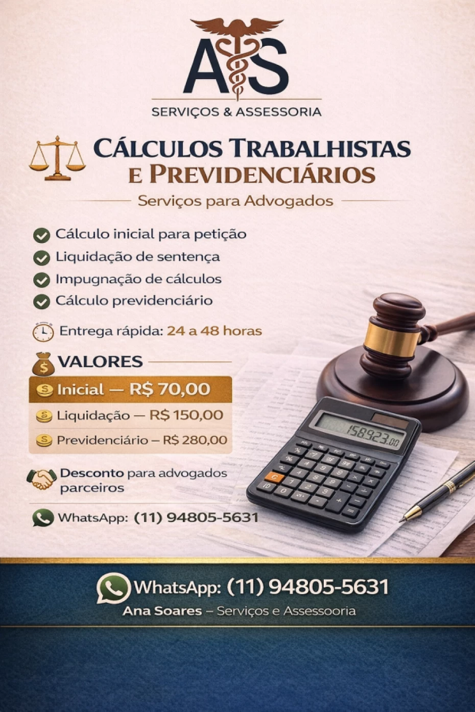 Se você é advogado e precisa de cálculo trabalhista em Ribeirão Pires/SP com rapidez, precisão e suporte confiável, a A.S Serviços e Assessoria está pronta para atender sua demanda com foco total em resultado. Atuamos com cálculo trabalhista para inicial e liquidação e cálculo previdenciário, entregando uma solução prática para quem não pode perder tempo com planilhas demoradas, retrabalho ou inconsistências que podem comprometer o andamento do processo.