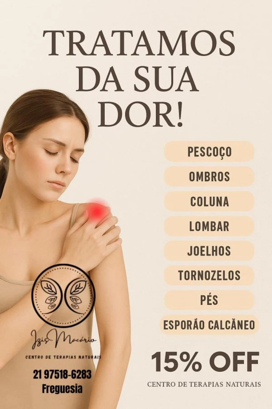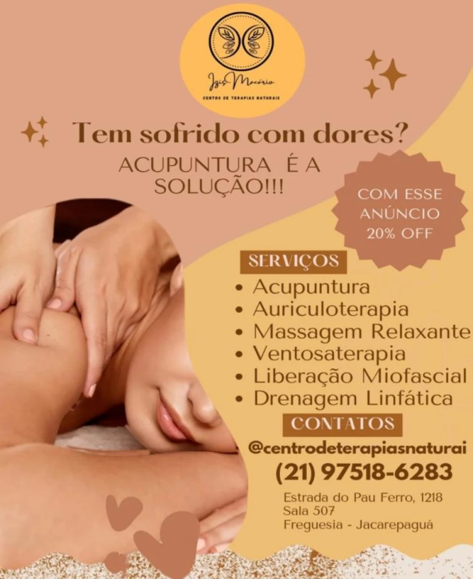 Bem-vindo ao nosso espaço de transformação e bem-estar. No Centro de Terapias Naturais Izis Macário, trazemos resultados rápidos e comprovados para as suas dores físicas e emocionais. Sabemos que a vida moderna pode ser estressante e desgastante, e é por isso que estamos aqui para oferecer soluções que realmente funcionam.